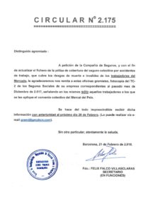 C I R C U L A R Nº 2.175 – FOTOCOPIA TC-2 – PERSONAL CASILLAS MERCAT DEL PEIX – DICIEMBRE 2.017 – CIA SEGUROS